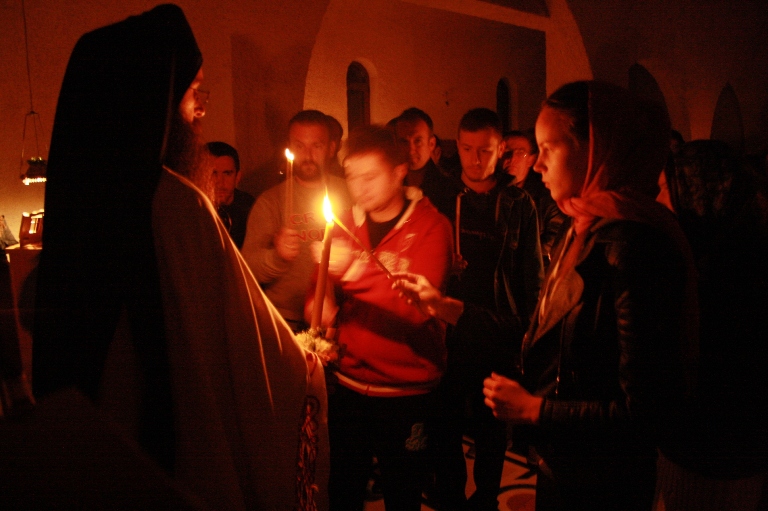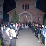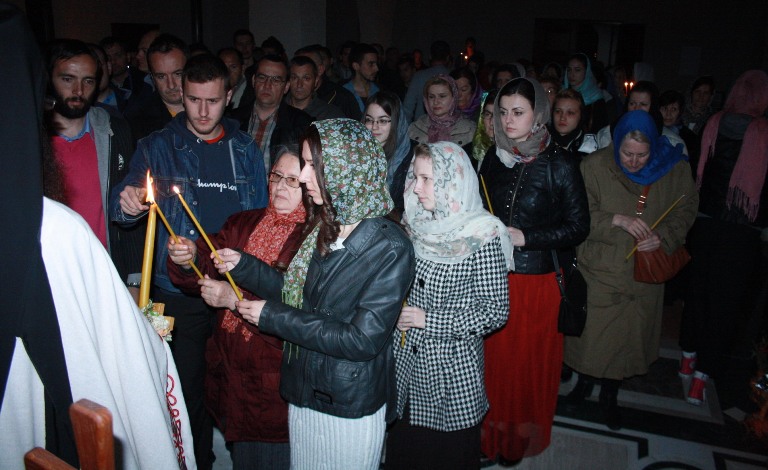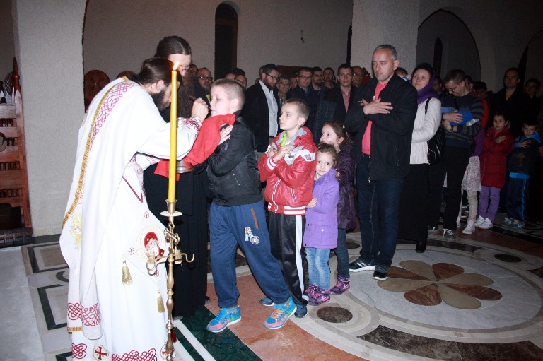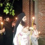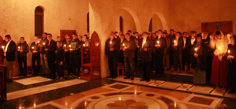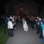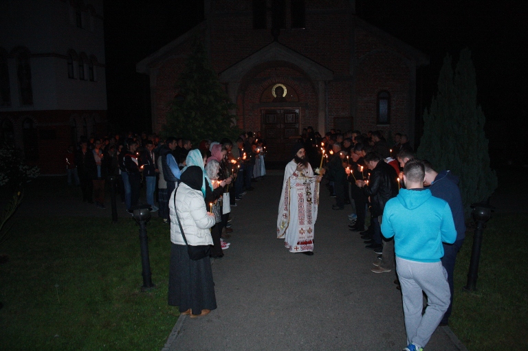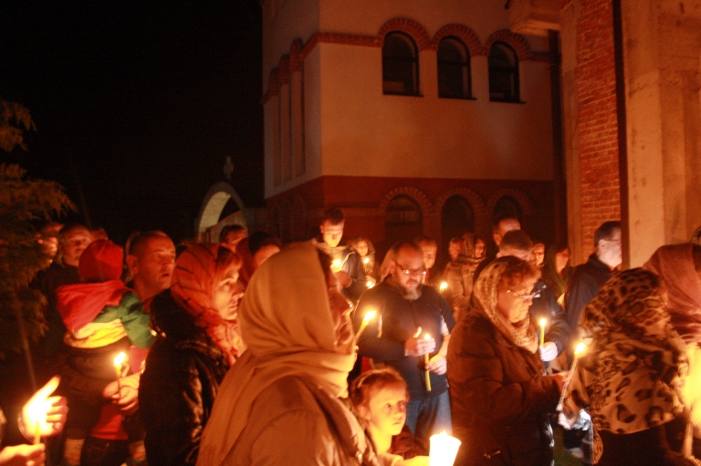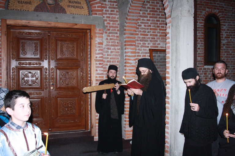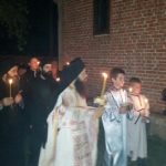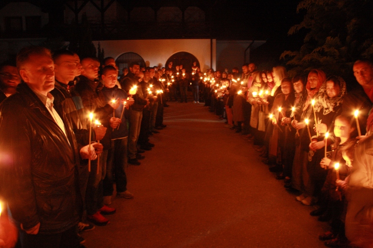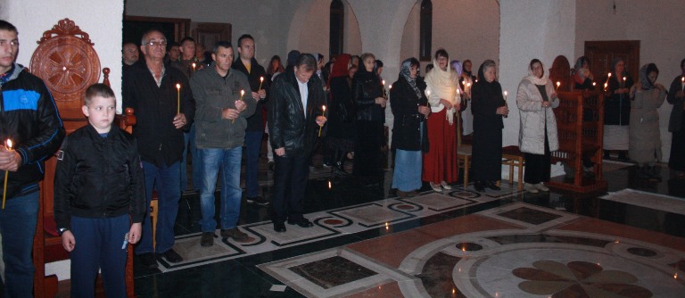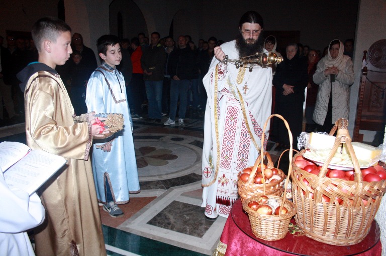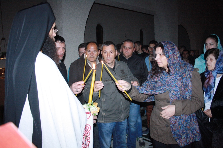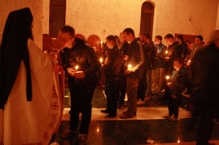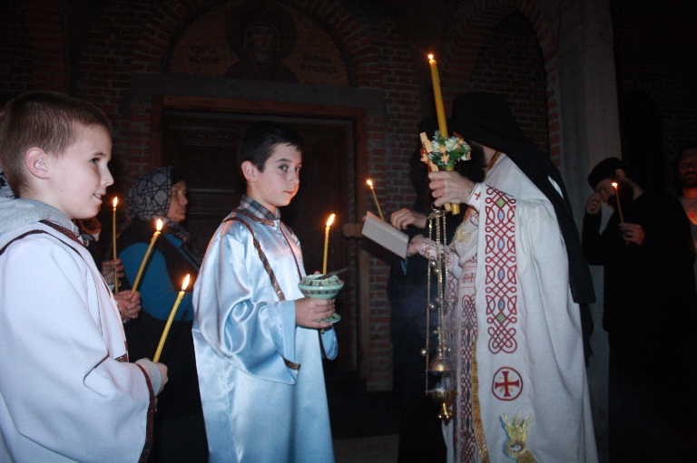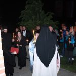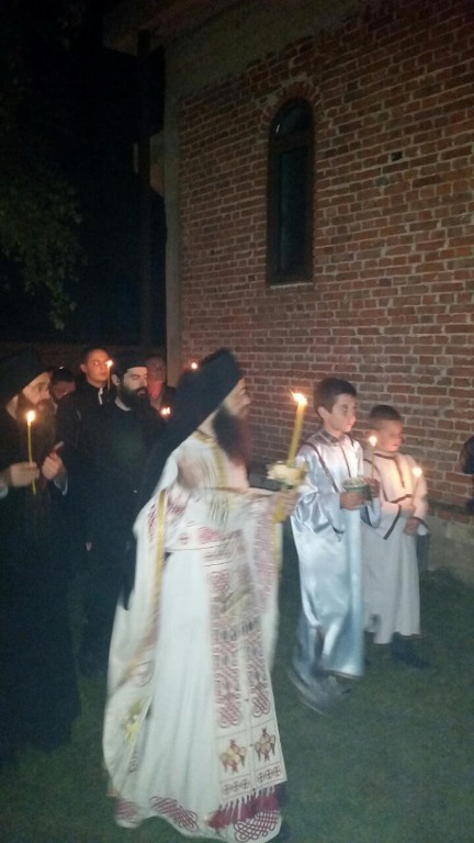 Тачно у поноћ звона са манастирског звоника огласила су почетак Васкршњег јутрења у Саборном манастирском храму Свете Великомученице Марине, у чијем наставку је служена Васкршња Литургија.